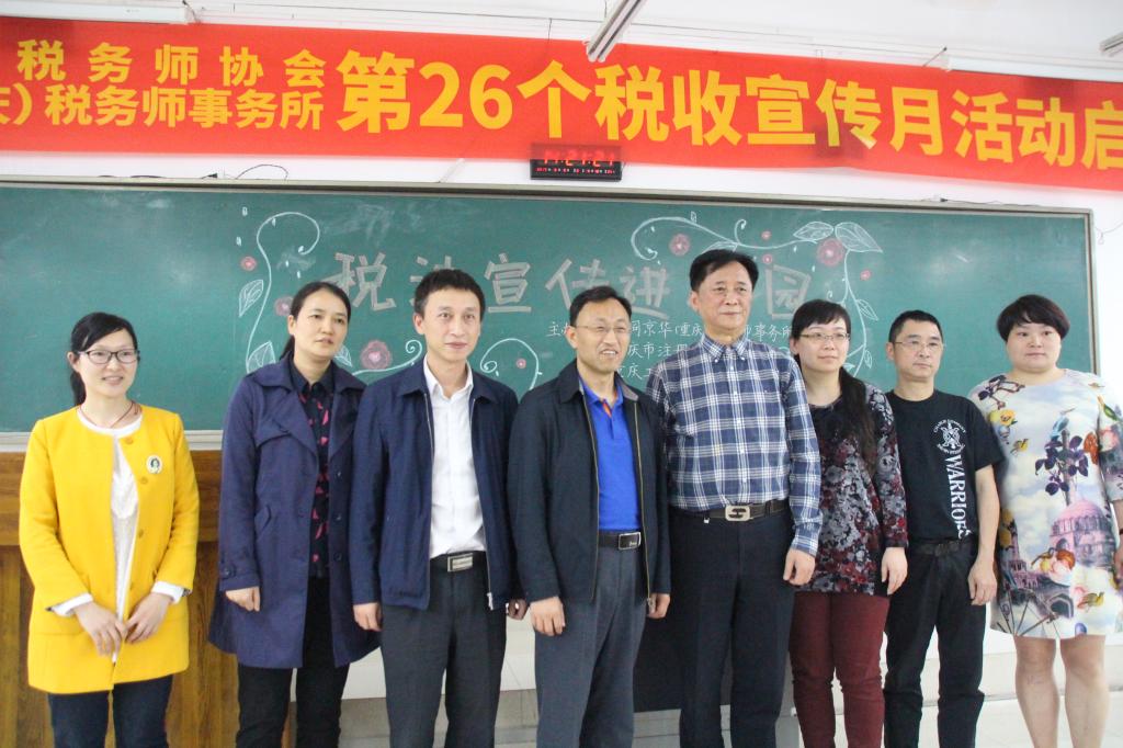 5月5日下午,由致同京华(重庆)税务师事务所、重庆市注册税务师协会、财政taptap点点体育联办的2017税法宣传进校园活动在南岸校区博智楼212教室成功举办。重庆市注册税务师协会副会长陈光信、重庆市注册税务师管理中心副主任王洪宇、taptap点点体育财政taptap点点体育党委副书记黄谦、致同京华(重庆)税务师事务所首席合伙人白云燕、注册税务师管理中心副处调研员徐勇、财政taptap点点体育财税系主任尚可文、致同京华(重庆)税务师事务所副总经理陈怡、财政taptap点点体育学团办主任兰丽娟出席了本次活动。