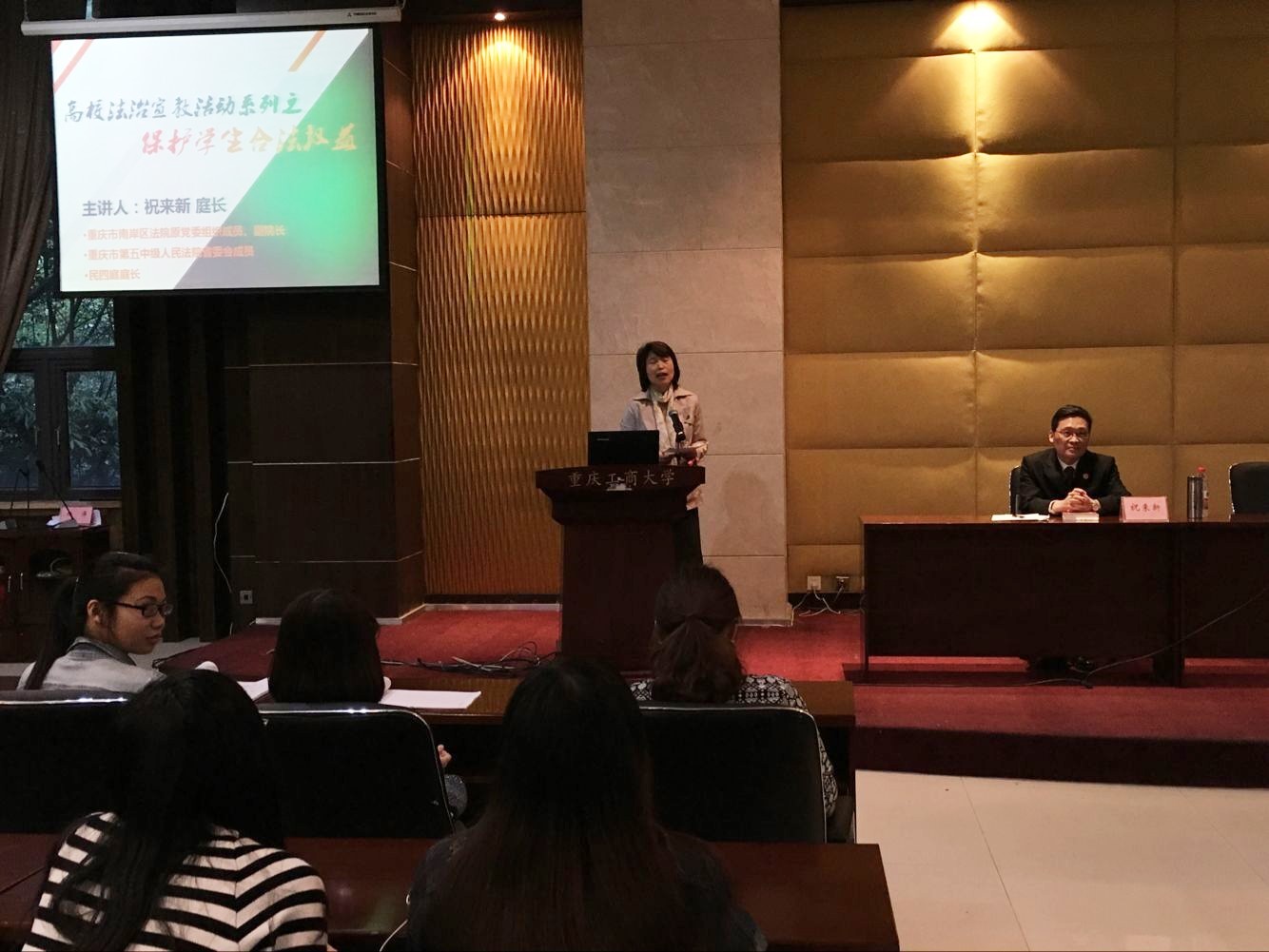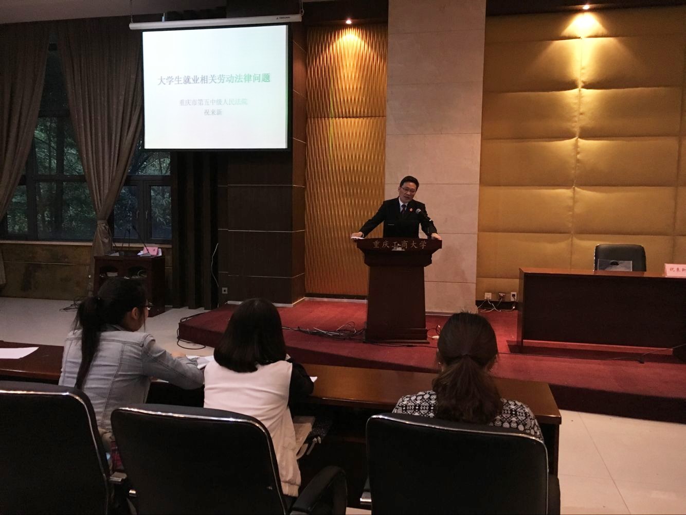 2016年4月26日晚,高校法治宣教活动系列之保护学生合法权益法律讲座在田家炳书院408报告厅成功召开。重庆市南岸区法院原党委组织成员、副院长,重庆市第五中级人民法院省委会成员、民四庭庭长祝来新;原重庆市南岸去法院副院长、原重庆市第五中级人民法院宣教处副处长陈绍惠受邀就大学生就业相关劳动法律问题进行知识宣讲。财政taptap点点体育党总支杨萍书记、分团委徐阔书记、校友联络员杨佳妮及校友代表张明佳出席了本次讲座。