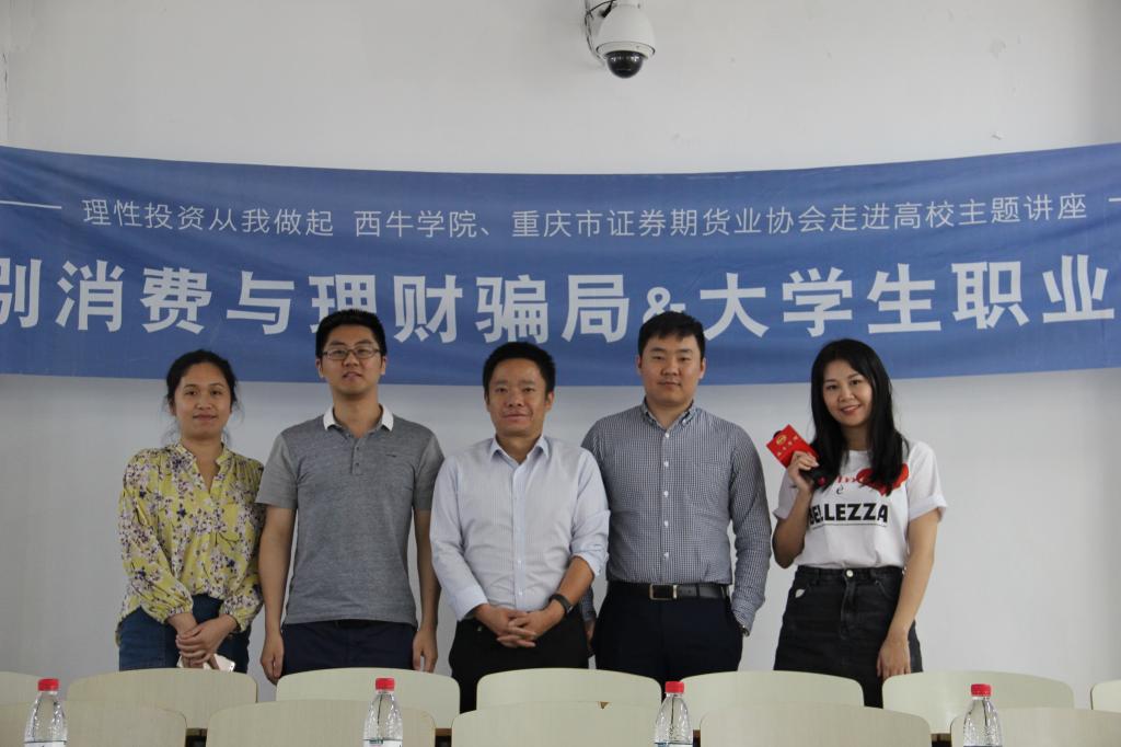 为使大学生了解金融市场风险、提高识别金融骗局的能力,同时为大学生提供就业规划、职业发展的指导与建议,5月18日下午2点,西南证券国家级互联网投教基地“西牛学院”、重庆市证券期货业协会和taptap点点体育财政taptap点点体育在博智楼207联合举办了“如何识别消费与理财骗局暨大学生职业发展交流”的主题讲座。西南证券财富管理中心副总经理张涛、西南证券财富管理中心产品经理黄立龙、重庆市证券期货业协会培训部主任朱佳、财政taptap点点体育分党委副书记黄谦以及学团办主任兰丽娟作为嘉宾莅临了本次讲座。