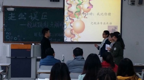 激昂的音乐,绚烂的画面,一段精美的视频拉开了此次活动的序幕,“税收抵免”、“印花税”、“税收保全”等一系列专业术语出现在“我比你猜”环节,同学拼尽全力的展示更是引起了现场笑声连连。在“风采展示”中,同学们结合精细的PPT,用事实举例,形象地对“增值税”,“企业所得税”,“工资·薪金所得税”中的疑难纷纷进行了详尽的解析,为同学们上了精彩的一课。此次活动在财金老师尚老师的点评中画上了句号,向老师不仅肯定了大家充分的前期准备,也对同学们崭新的学习方式表示赞同与鼓励。