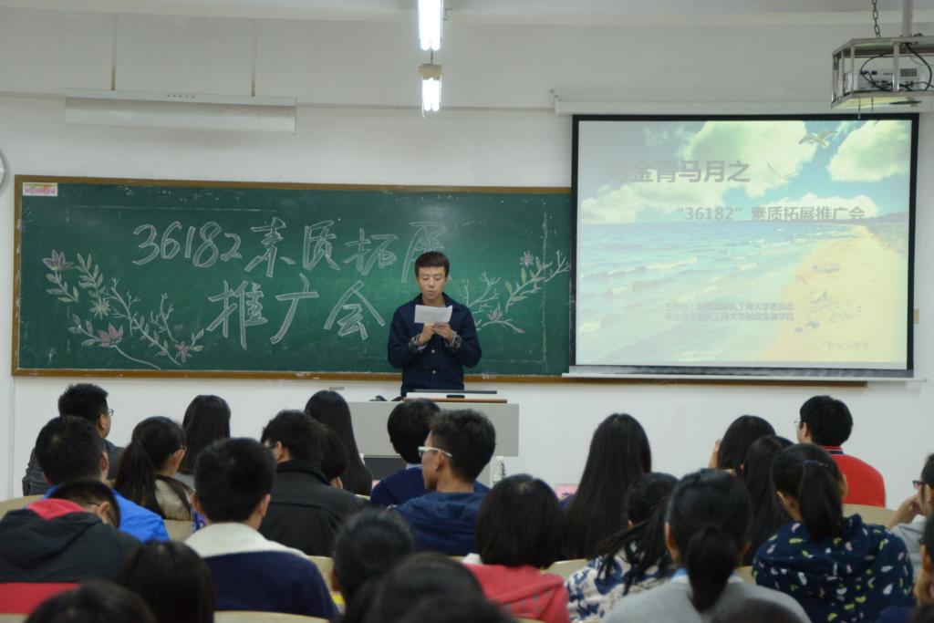 2015年11月5日,财政taptap点点体育分团委学生会组织开展了“36182”素质拓展工程推广会,对15级CFA新生进行素质拓展的全面讲解,并邀请了校学生会素拓部部长徐义配,财金学院学生会副主席李超,素拓部部长参加本次素拓推广会。