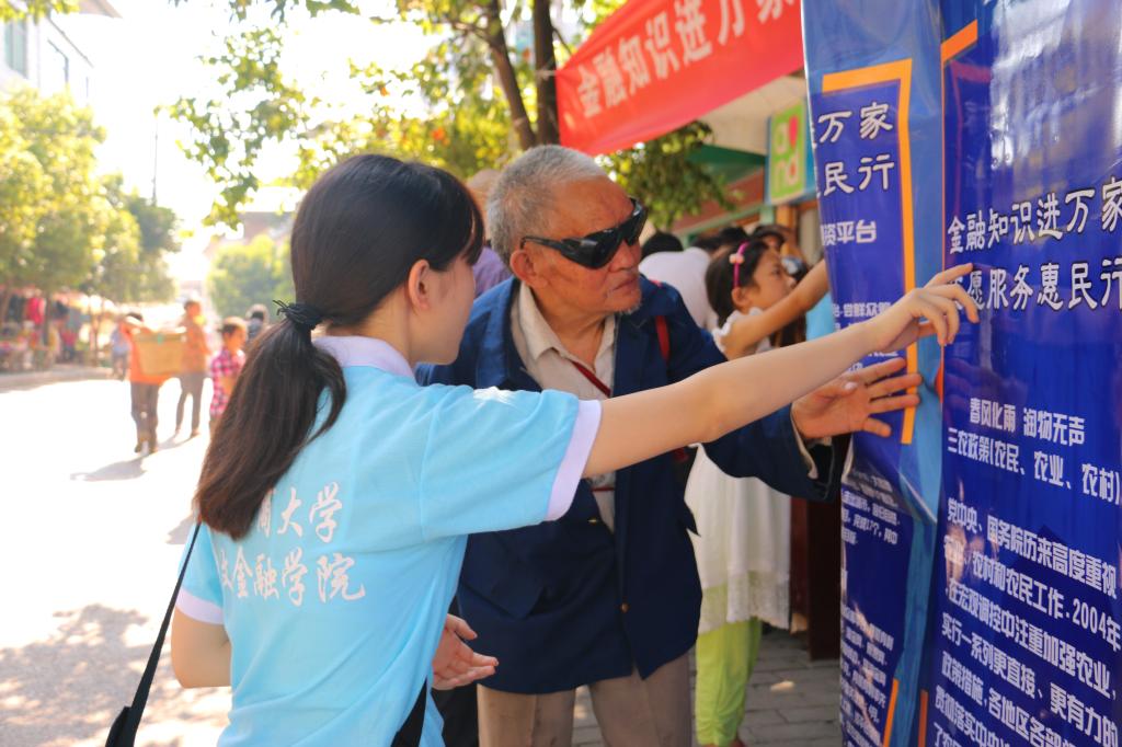 金融知识宣讲部分主要包括个人贷款业务、银行卡业务、金融风险防范,ATM机基本安全知识等板块。宣讲结束后,一位阿姨表示“感谢大家给我们带来了金融知识,你们要好好学习,争做祖国的人才”。随后的金融APP游园活动则将股票、手机购物、商业银行的APP操作流程制作成海报供乡民们参观。在这个过程中,一位老人虽然听力有限,但仍仔细聆听成员们的讲解。这让同学们在酷热天气依然保持活动的热情和积极性。而最后的金融知识灯谜则将整个活动推向了高潮。现场分为题目区、答案区、兑换区,三个区域环环相扣,以别样的活动方式普及了金融知识。