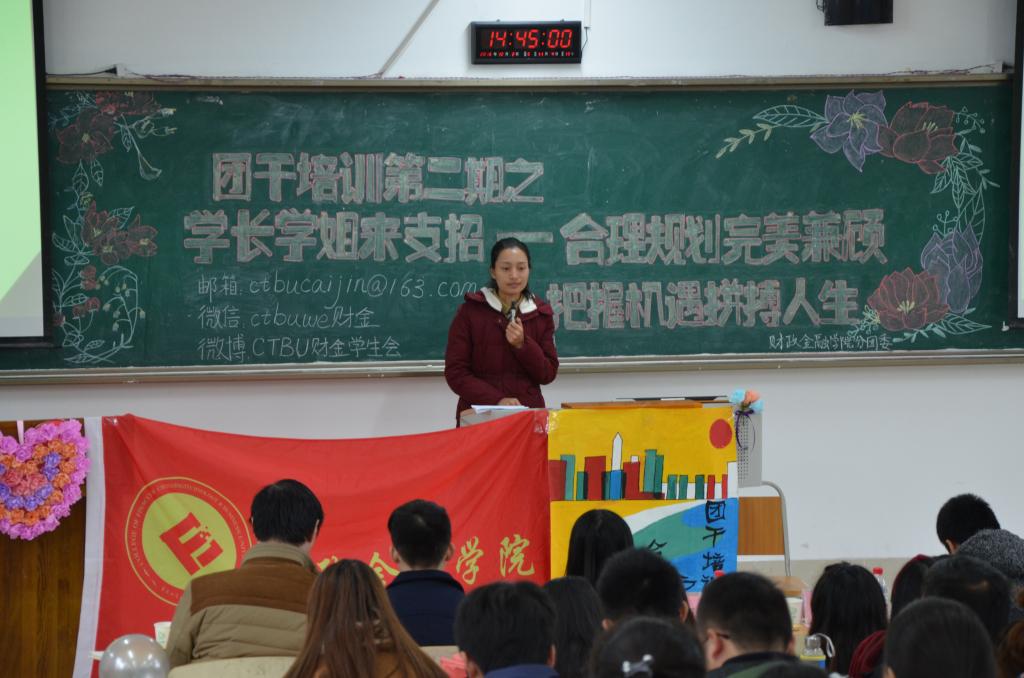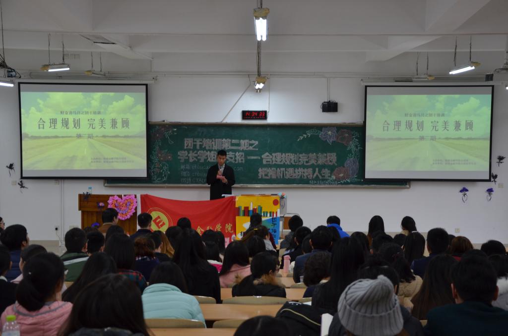 2016年12月2日14:30,财金青马月系列活动之团干培训第二期在南岸校区博智楼07221圆满举行。本次团干活动的主题是“合理规划,完美兼顾”。优秀学姐陶小兰、刘良丽,优秀学长黄金水、刘润哲与财金学院各班级班长、团支书以及学生会主席团、各部门部长共同参与了本次活动。
