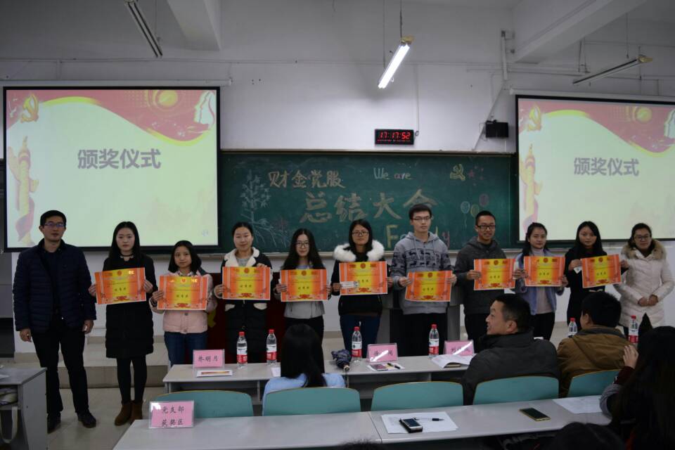 时光飞逝,又一个学期即将就此画上圆满的句号。为总结财金党服本学期的工作状况,也为了提升财金党服干部的工作积极性,表彰党服优秀团队和个人,2016年12月15日下午17点,财金党服在博智楼107举行了“财政taptap点点体育党员服务站总结表彰大会”。出席本次大会的有财金党总支副书记刘代成、财金分团委书记徐阔、财金第一党支部书记文理、财金第三党支部书记范乐乐、财金学科竞赛指导老师余红霞、党服指导老师乔明月、财政taptap点点体育党员服务站全体同学及其相关获奖代表。在财金党服干部彭枭、马丽君的主持下,本次财金党服总结表彰大会正式拉开帷幕。