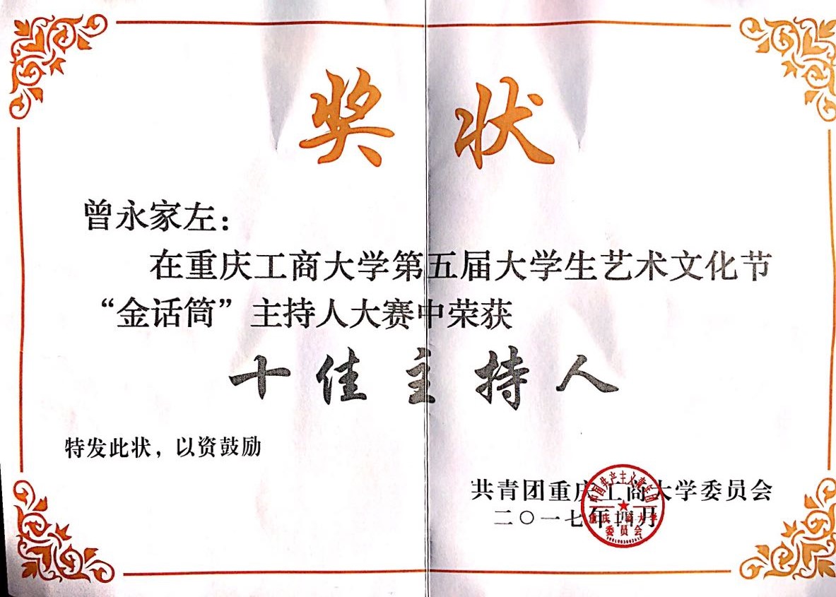 雏凤清于老凤声,在金话筒主持人大赛中,taptap点点体育官网参赛选手经过初赛、复赛层层选拔进入决赛,让评委和观众领略到了财金学院学子的风采。经过四个环节的激烈角逐,taptap点点体育官网曾永家左同学取得了第六名的好成绩,荣获“金话筒”主持人大赛“十佳主持人”称号。