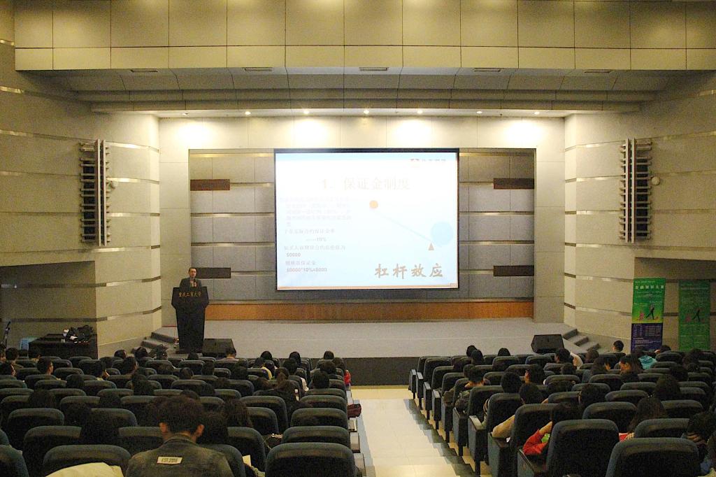 最后万鹏先生针对期货知识,从概念、交易制度、交易的功能以及期权基础知识四个方面进行了详细的讲解。在介绍中,万鹏先生注意与学生之间的互动,时不时地发问了解情况。讲述了4月19日郑州商品交易所白糖期货合约的实例和《圣经》中关于古代期货起源的记载以及近代期货交易的起源的故事,引起同学们的兴趣。
