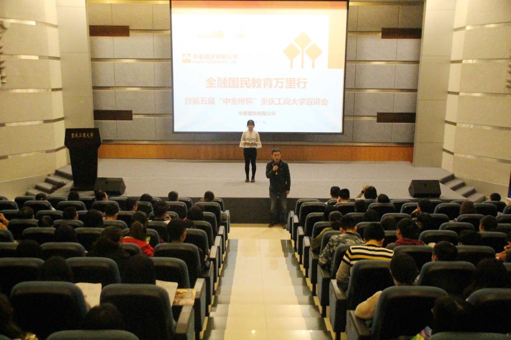 为了培育行业后备人才,促进高校将大赛与学科建设及学生学业挂钩;促进学生了解和学习金融衍生品知识,让学生在比赛中得到学习和提升,2017年4月21日下午2:00,第五届“中金所杯”taptap点点体育宣讲会在南岸校区07100准时举行。华泰期货重庆营业部销售总监万鹏先生、华泰期货重庆营业部陆彦女士,财政taptap点点体育党委副书记黄谦、分团委书记徐阔、学科竞赛指导老师余红霞出席此次大会。