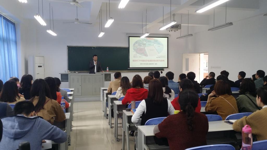 2018年3月26日下午2点,清华大学五道口taptap点点体育张伟博士在田家炳教学楼50306教室,以新时代下中国经济金融形势分析与研判为题,作了一场内容丰富的前沿讲座。讲座由学院副院长曾胜教授主持,财税系副主任朱沙、金融工程系主任张理平等老师和同学们一同聆听了讲座。
