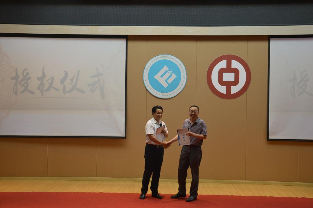 最后,符代权行长与刁孝华院长上台互授赛事授权书并联合宣布第一届“中国银行杯”银行营销大赛正式开始。仪式末尾全体嘉宾与在场工作人员上台合影。