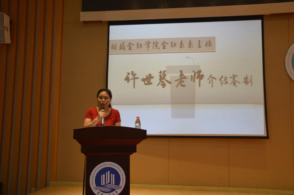紧接着,金融系主任许世琴老师为在场的财金学子介绍了初赛规则及赛制流程。她强调,在暑期培训及实习时,应遵循学校纪律和银行对于职员的规定,大赛评委会根据得分制对参赛者进行考核,选手们应力争上游,展现自己最好的一面。