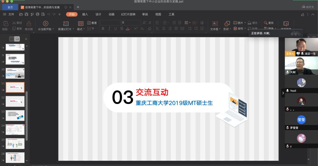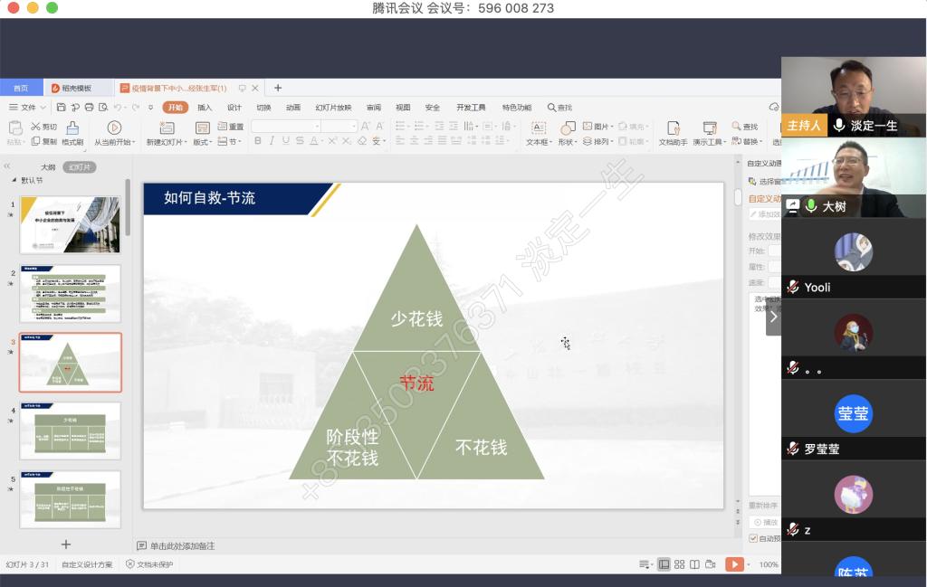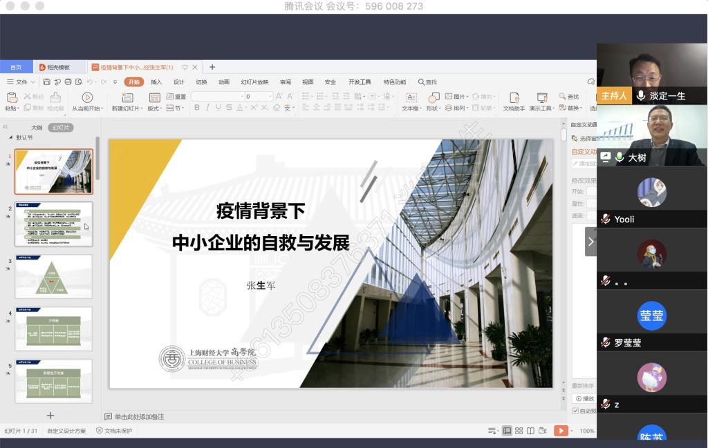 4月9日晚上,我校税务硕士教育中心通过腾讯会议成功举办了本年度第一次南山税务沙龙——疫情背景下中小企业的自救与发展。本次沙龙由taptap点点体育尚可文教授主持,特邀请迅驰车业江苏有限公司副总裁、上海财经大学硕士生导师张生军博士主讲,我校2019级税务硕士研究生参加了沙龙。