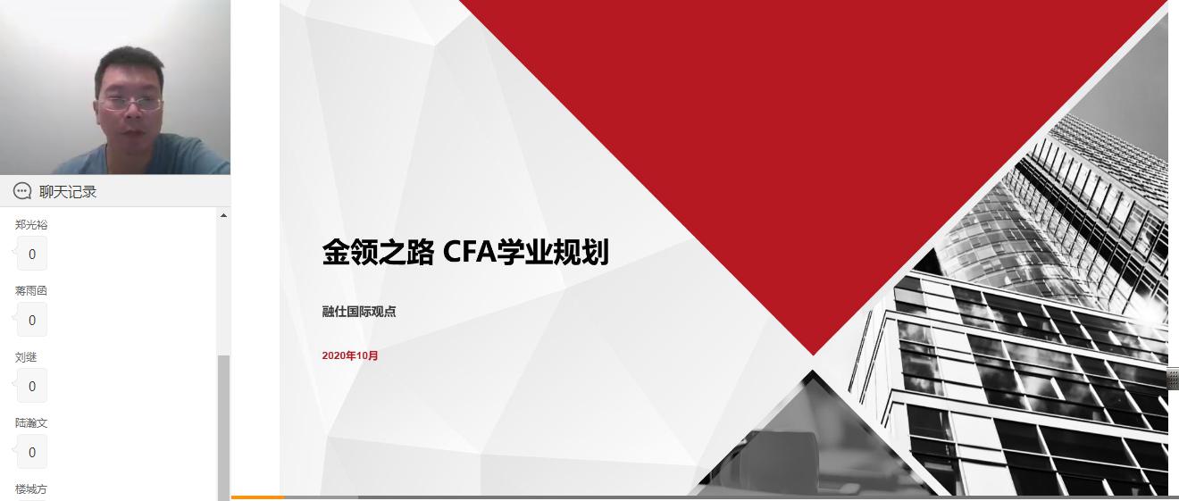 2020年10月16日下午7点,20级CFA国际项目班《职业规划讲座》顺利举行。融仕国际教育教研院院长李罗宾老师作为本次讲座的主讲人,对新生的四年规划做了详细的说明。
