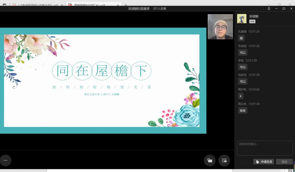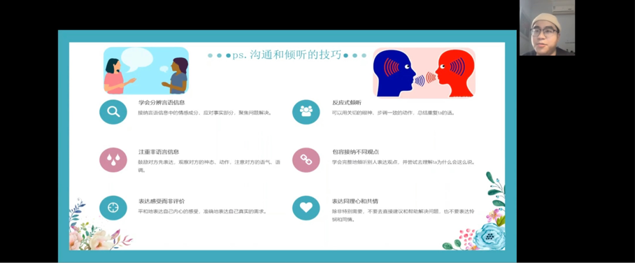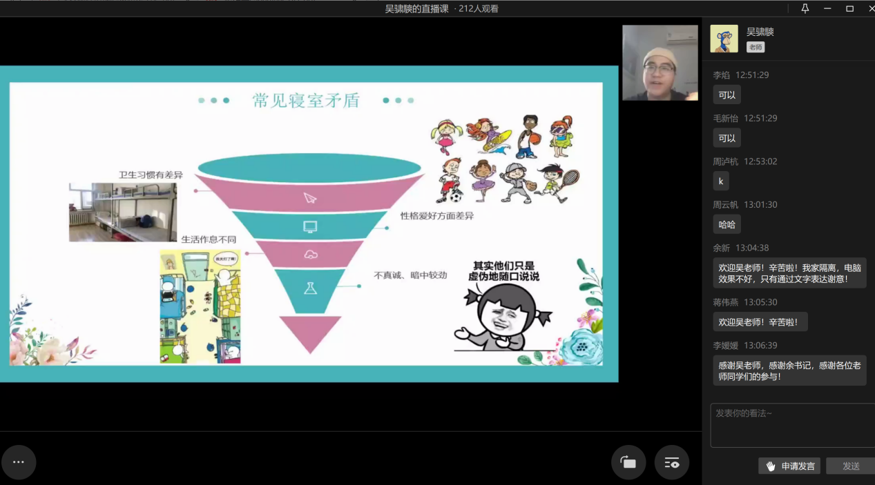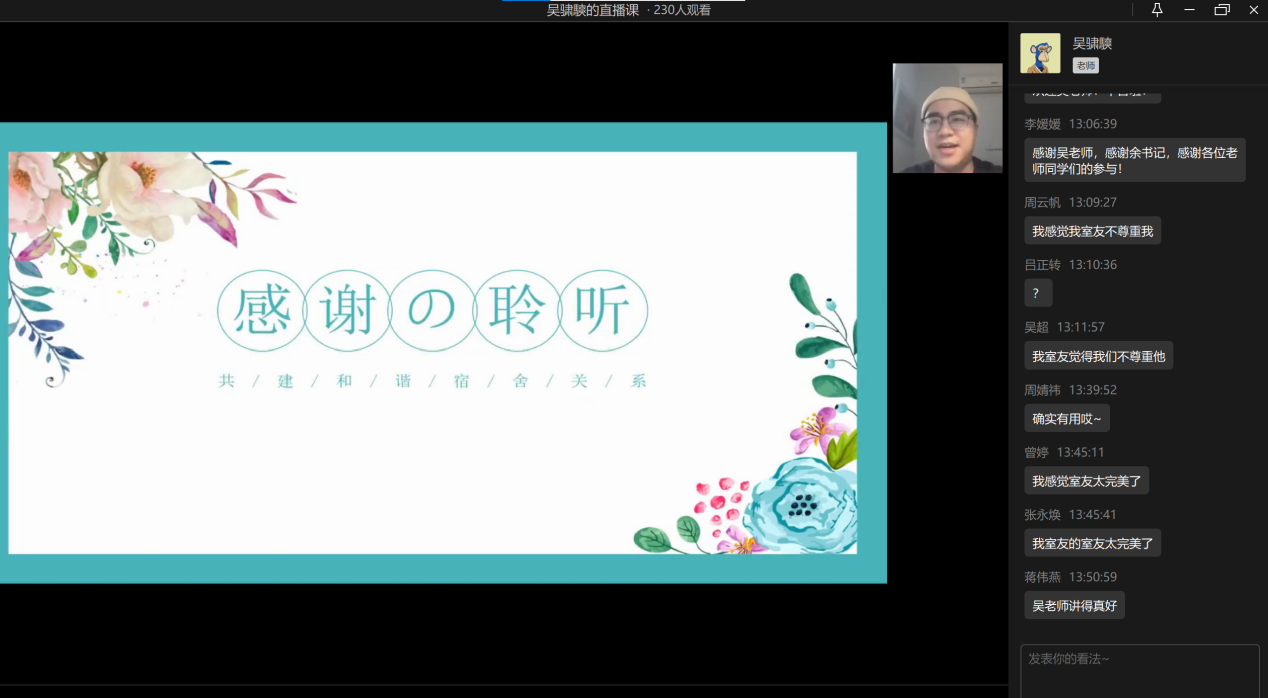2022年11月11日中午13点,taptap点点体育心理工作站主办的“同在屋檐下——和谐寝室关系”心理讲座于企业微信线上平台顺利举办。此次讲座邀请到了学校心理健康教育与咨询中心吴骕騻老师作为主讲人,讲座内容丰富、寓教于乐,受到了同学们的热烈欢迎。