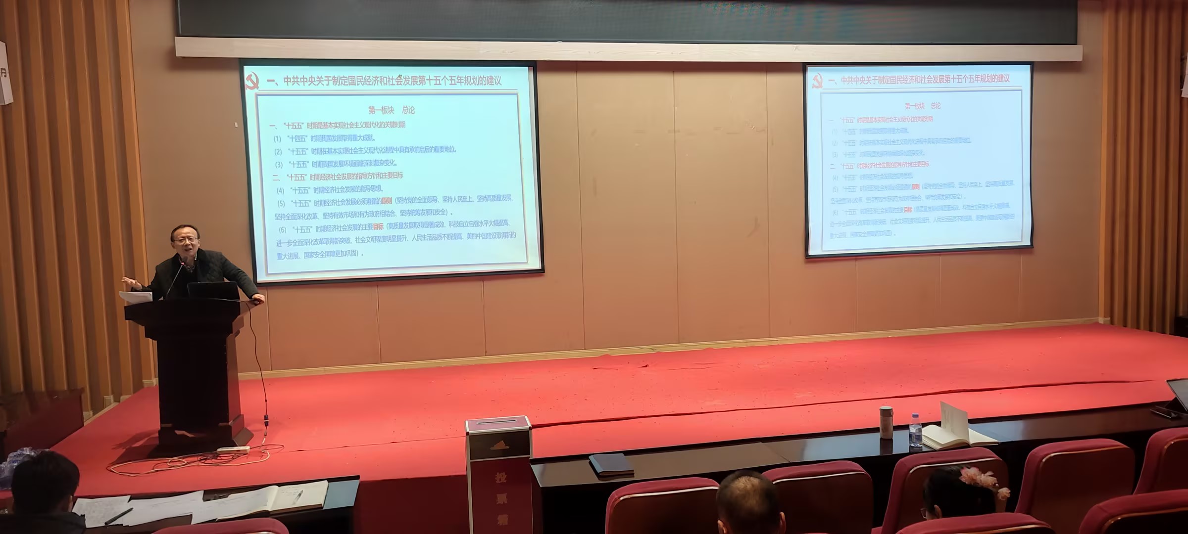 首先,开展教职工政治理论学习。党委书记、副院长石世明领学了《中共中央关于制定国民经济和社会发展第十五个五年规划的建议》《重庆市委召开全市领导干部会议传达学习贯彻党的二十届四中全会精神》,特别就与学院和教职工发展的相关内容进行深入全面的解读和强调,并要求大家认真研学并结合自身需要做好教学科研工作。