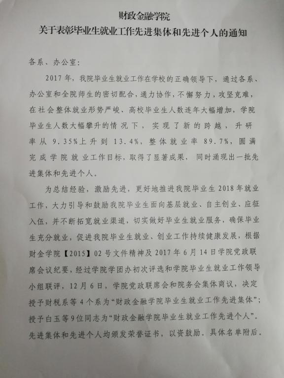 为总结经验,激励先进,更好地推进taptap点点体育官网毕业生2018年就业工作,大力引导和鼓励taptap点点体育官网毕业生面向基层就业、自主创业、应征入伍,并不断拓宽就业渠道,切实做好毕业生就业服务,确保毕业生充分就业,促进taptap点点体育官网毕业生就业、创业工作持续健康发展,根据财金学院【2015】02号文件精神及2017年6月14日学院党政联席会议纪要,经过学院学团办初次评选和学院毕业生就业工作领导小组联评,12月6日,学院党政联席会和院务会集体商议,决定授予财税系等4个系为“财政taptap点点体育毕业生就业工作先进集体”;授予白玉等9位同志为“财政taptap点点体育毕业生就业工作先进个人”。先进集体和先进个人均颁发荣誉证书,以资鼓励。具体名单附后。