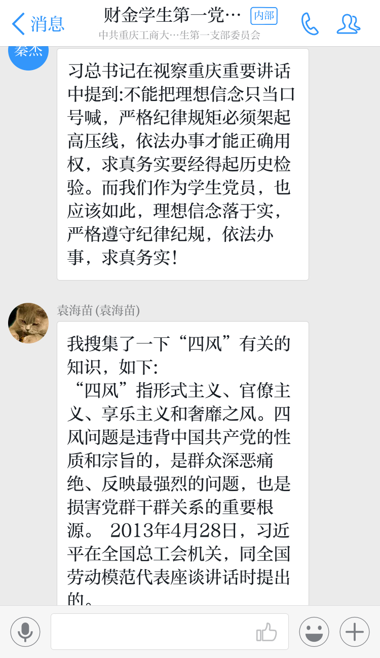 首先,秦杰同志表示作为学生党员,应将理想信念落于实,严格遵守纪律,依法办事,求真务实。袁海苗同志也分享了有关“四风”的知识,加深了党员同志对于“四风”问题的认识与理解,其他党员同志也针砭时弊,切中要害地分享了自己的看法与理解。