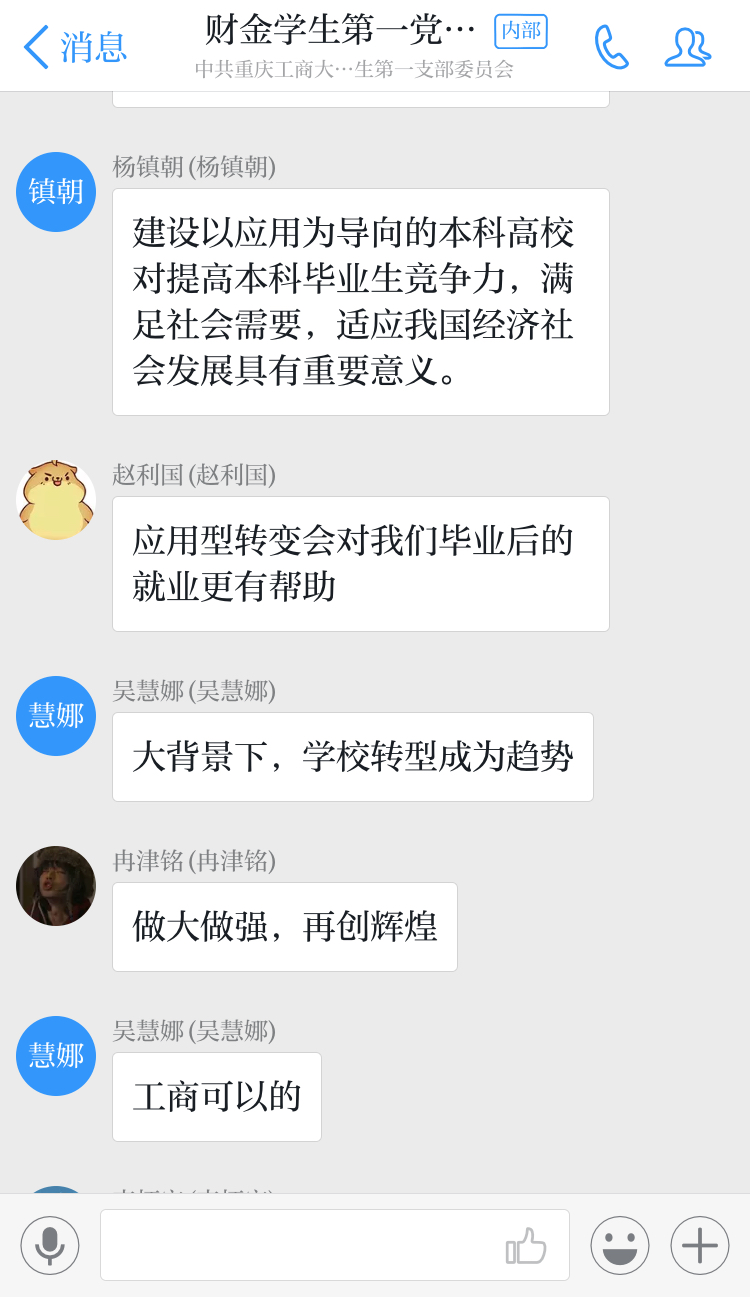 2019年2月18日,财金学生第一党支部组织全体党员进行了寒假第二次交流学习。本次学习由赵利国同志主持,支部全体党员同志参与。交流学习内容包括:1.学习习近平总书记视察重庆重要讲话、习近平总书记参加重庆代表团审议时重要讲话以及习近平总书记关于进一步纠正“四风”、加强作风建设的重要指示等精神2.由黄丽媛同志分享并简单介绍热点新闻:“国家发文!一大批普通本科高等学校将向应用型转变”。