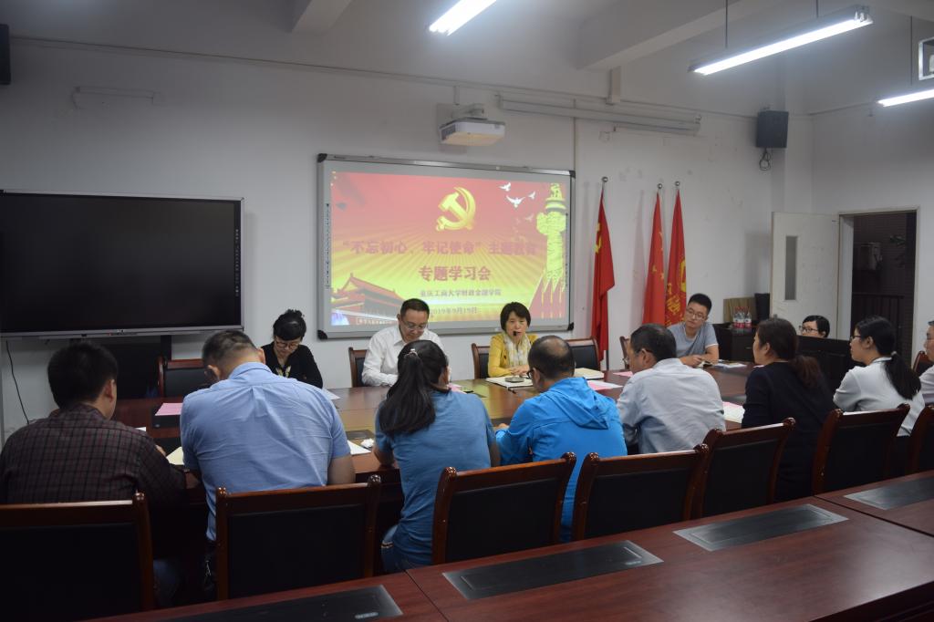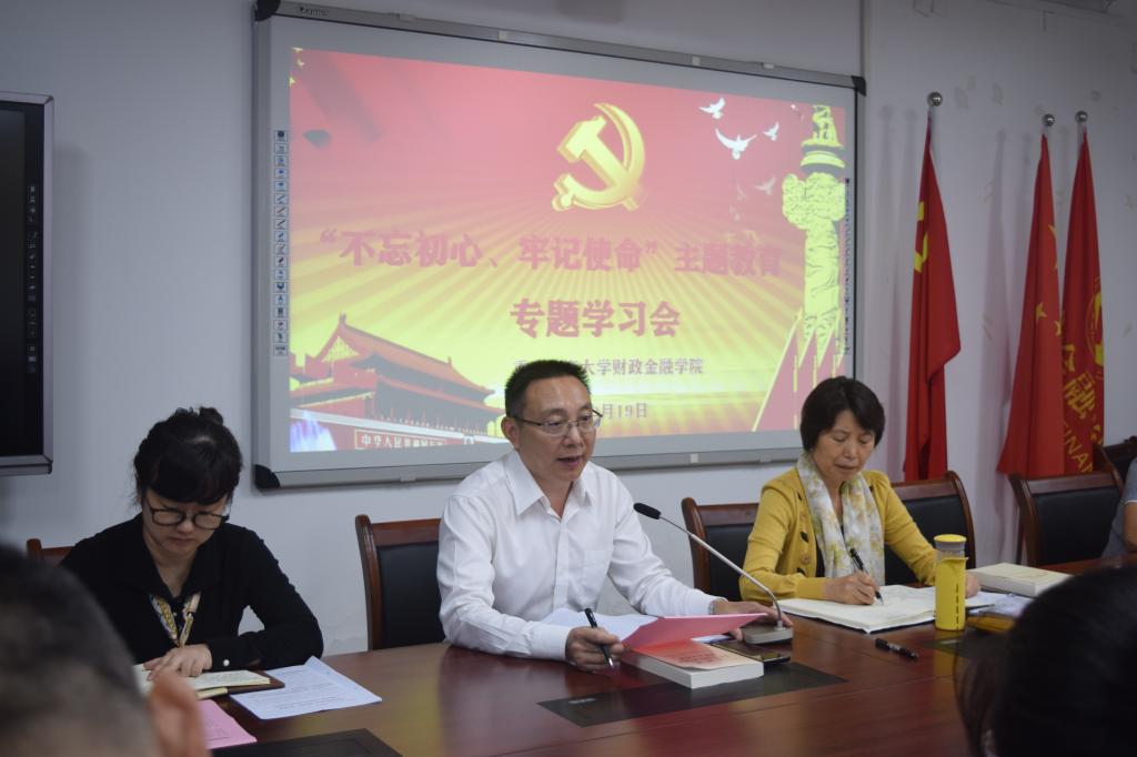 按照校党委“不忘初心、牢记使命”主题教育工作安排,9月19日,财政taptap点点体育召开了“不忘初心、牢记使命”主题教育专题学习会暨第一次集中学习研讨会。校 “不忘初心、牢记使命”主题教育巡回指导二组副组长、校党委宣传部部长华杰同志亲临会议现场进行监督指导,学院领导班子全体成员、各支部书记参加了会议。会议由院党委书记杨萍同志主持。