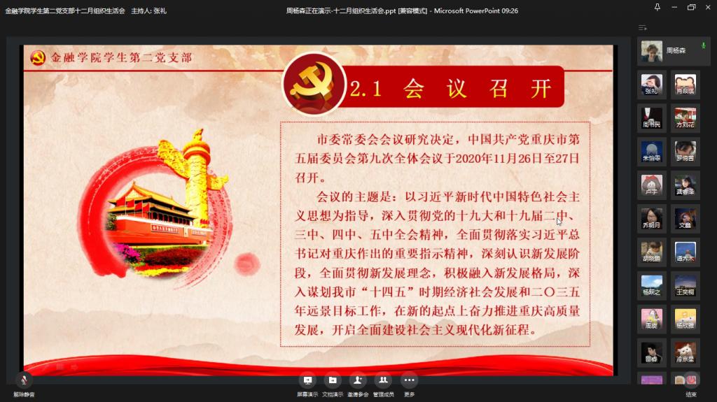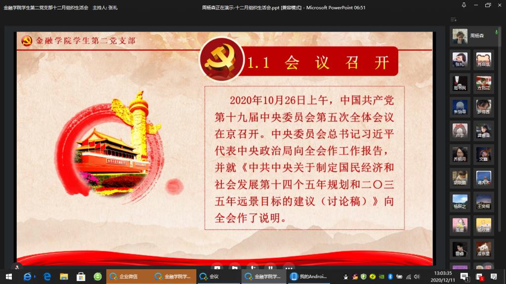 为全面贯彻落实党的十九届五中全会精神,进一步加强党员同志们的政治思想觉悟,taptap点点体育学生第二党支部于2020年12月11日在企业微信举行了十二月组织生活会。出席本次大会的成员有taptap点点体育学生第二支部书记乔明月老师和支部全体党员同志。本次会议主要由党员同志领学新精神、分享心得体会和总结发言三个环节构成。