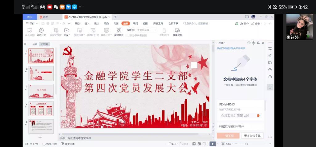2021年5月21日周五晚上20:40,taptap点点体育taptap点点体育分党委学生第二党支部于企业微信线上会议,召开了五月第四次党员发展大会。本次党员发展大会由刘洁同志主持,学生第二党支部书记乔明月、学生第二党支部正式党员、预备党员、发展对象参加了这次活动。本次党员发展大会主要讨论了三位发展对象——唐莲霞、秦子熠、杨梅发展成为预备党员的问题。