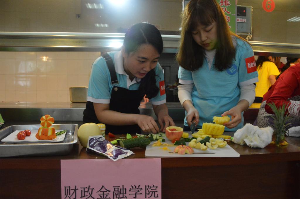 比赛开始前,现场观众就十分热情,期待选手们带来的美食盛宴。在主持人的随机采访中,财金啦啦队有幸被第一个采访并高声喊出了学院的口号:财金美食,别具匠心;余香缭绕,沁人心脾。一轮采访后,主持人介绍到场嘉宾,比赛便正式拉开帷幕。各个学院分为三组,轮番上阵,每队中两人负责菜品烹饪,另两人则负责水果拼盘;选手们在二十分钟内大展身手,秀尽厨艺,做出了一道道香喷喷的菜肴和精美的水果拼盘。其间,观众们在享尽眼福、口福的同时,也积极参与互动。惊险的吹气球单人比赛、高难度的吃薯片比赛、考验默契的画画猜意比赛等得到观众的热情参与。最终,财政taptap点点体育获得92.28分的好成绩。