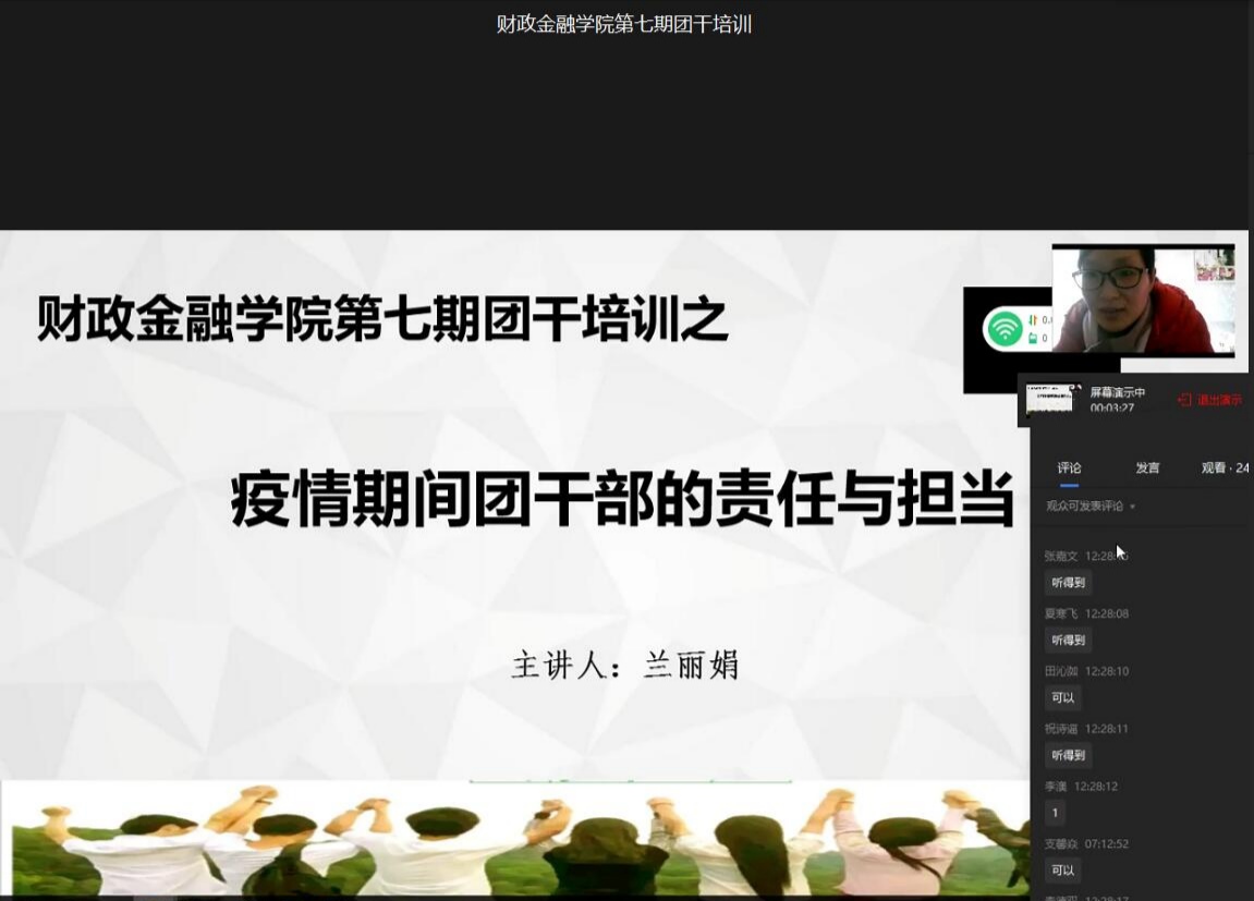 2020年3月10日,taptap点点体育财政taptap点点体育第七期团干培训在企业微信线上直播圆满成功,此次直播由财政taptap点点体育分团委副书记兰丽娟老师主讲。第十八届财政taptap点点体育分团委学生会全体主席、部长参与了此次直播培训。