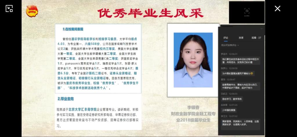 活动以学习“习近平总书记关于青年工作的重要论述”展开,揭示了青年与中国梦之间的关系论述以及对于新时代青年的期望。随后,孟菊向大家展示了学院往届的优秀毕业生,可以看出这些毕业生在大学期间就有了坚定的目标,并且在大学四年通过参加竞赛、考取证书等方式为自己的梦想而不断的做出努力。作为青少年一代,大家心中都应该树立一个与这个时代主题同心同向的理想信念,当每个人都在不断的为了梦想而努力奋斗的时候,我们离中国梦的实现就更近了一步。