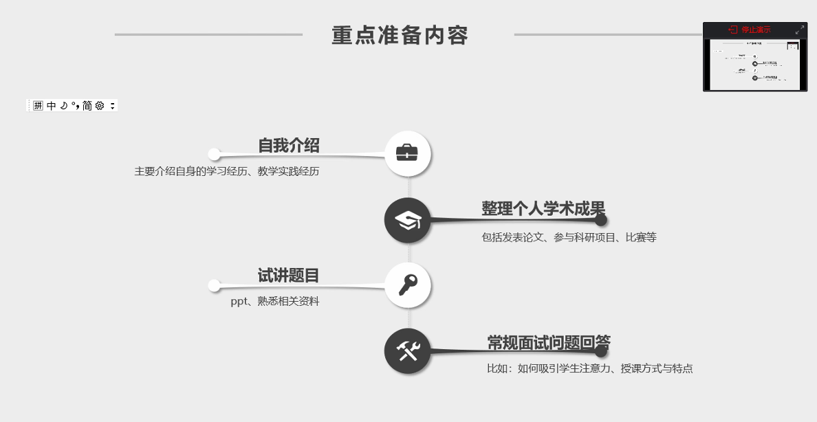王璇学姐与同学们交流了在求职大学教师类职业的流程以及在面试时应当注意的事项,主要包括:自我介绍,整理个人学术成就,试讲题目以及常规面试可能遇到的问题。