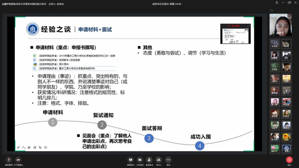 2020年9月12日上午10:00,taptap点点体育国奖及校长荣誉奖申报经验分享会于企业微信准时召开。出席此次分享会的有taptap点点体育党委副书记余新书记以及辅导员老师,两位曾获得过校长荣誉奖的优秀学姐,以及taptap点点体育的一百多位同学。