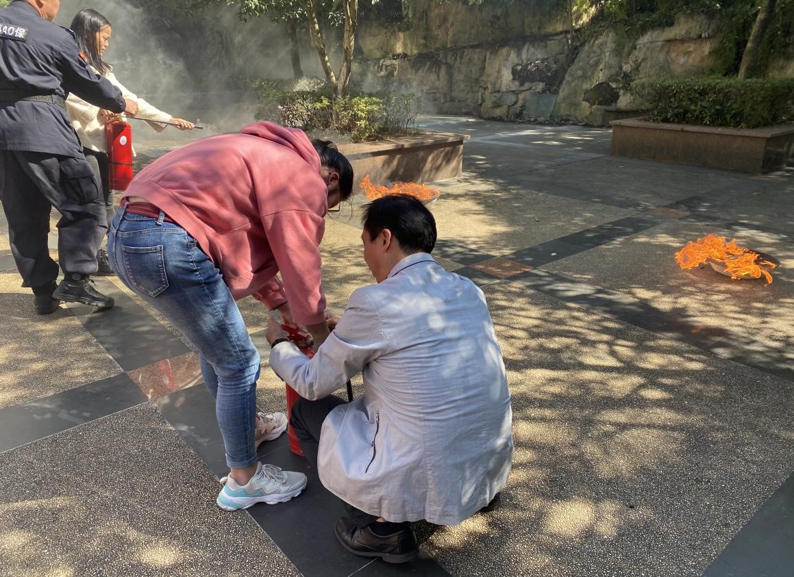 (图为学生和老师体验使用灭火器)