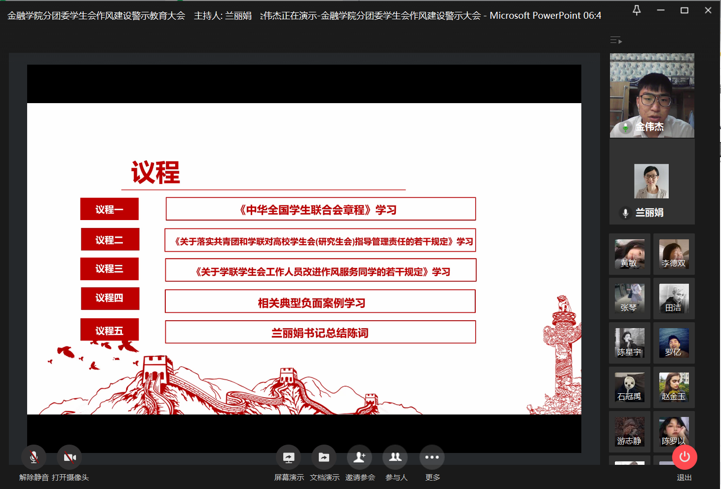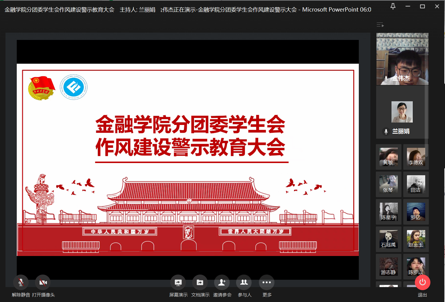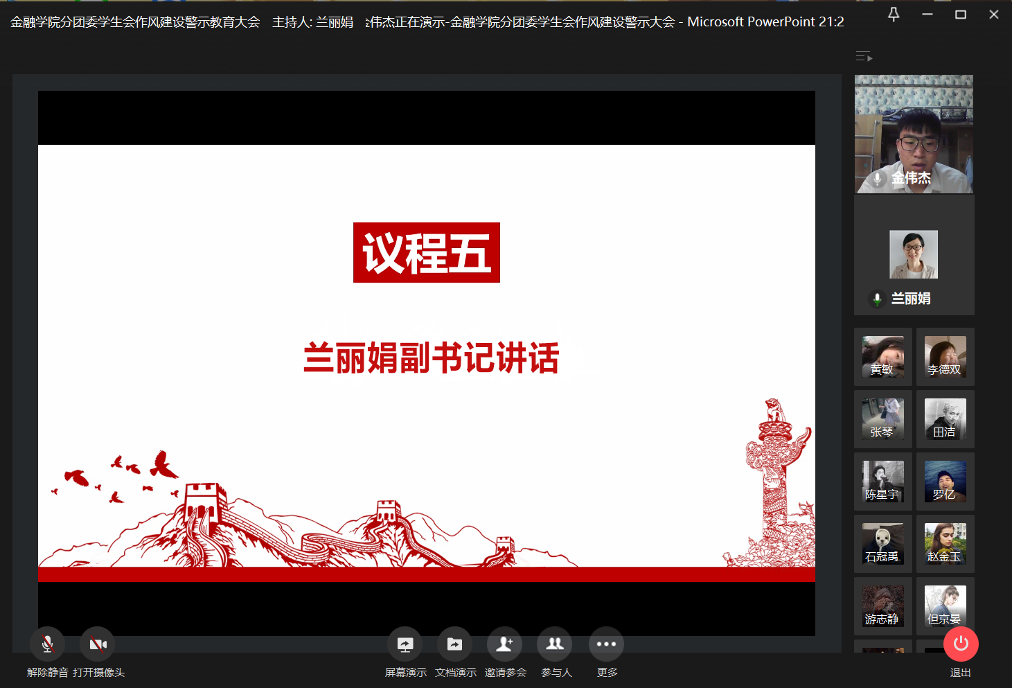 为加强学生干部作风建设,引导学生会和谐健康发展,2020年11月25日21:00,taptap点点体育分团委学生会于企业微信召开线上作风建设警示教育大会,学工办副主任、分团委副书记兰丽娟老师与学生会全体成员参与了本次大会。