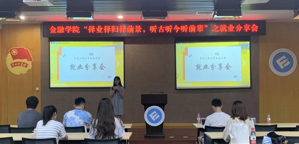 首先,杨名路主要从保险行业进行经验分享,分为两个部分,第一部分以“海王”为题展开讲解自己的求职经历,讲述他梦碎巴南税务局时,转变成“海王”广撒网,投递多份简历。当同时得到多家公司邀请时,仔细斟酌,把握好自己对工作的需求。第二部分讲解求职干货,包括求职流程,如何写简历,以及参加面试时注意事项,他以幽默的语言让同学们对如何求职有了明确的了解。然后,卿琦官从银行、证券公司和保险公司三个方面向同学们讲述了每个行业的特点以及面试不同行业的注意事项,内容广泛而富有实践价值。最后进入提问环节,参会同学积极提问,两位同学认真解答,解决了他们关于就业的疑惑,气氛达到了高潮。