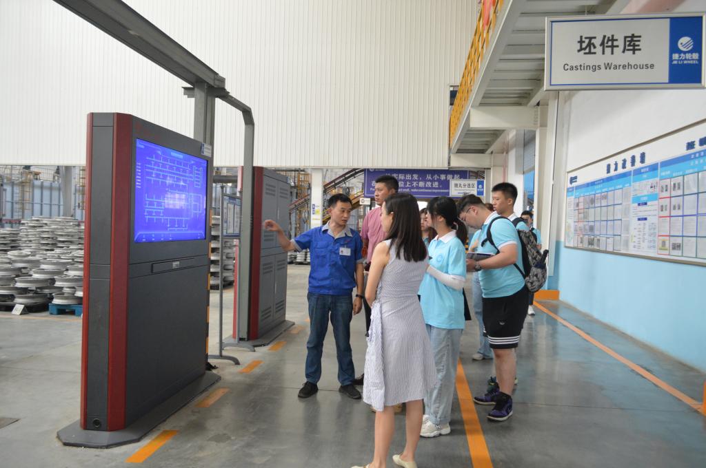 工业兴,则经济兴。实践团跟随垫江县工业园区管委会开发服务中心副主任张茜走进重庆捷力轮毂制造有限公司,感受高新技术的魅力。该公司是一家集研发、生产、销售和自营进出口于一体的摩托车汽车铝合金轮毂制造企业,已连年被国内外众多摩托车厂家评为A级优秀供应商。在企业车间走访中,重庆捷力轮毂制造有限公司生产管理部部长唐德波介绍到,车间流水线均由智能化机械操作,大大节约了人力成本,同时增添了智能化看板,能快速有效地智能化检测到刀具磨损、使用寿命、生产产量等数据,相比以前的旧厂房大幅度增值增产。“唯细唯精,恒志恒为”、“全心全力,尽善尽美”,正是这宝贵的工匠精神助推企业不断改革创新,提档升级!