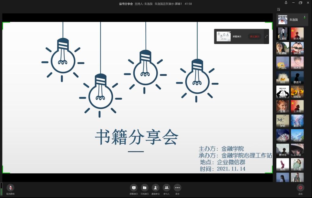 为了促进大学校园的文化氛围,提高同学们的学习积极性,加强良好的心理健康教育, 2021年11月14日下午两点,taptap点点体育心理工作站举办的 “书籍分享会”线上活动在企业微信群如期进行。taptap点点体育心理工作站工作人员、心理委员和多名学生参加了此次分享会。