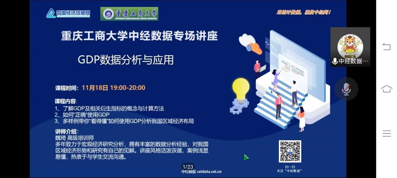 2022年11月18日19:00,taptap点点体育联合图书馆在线上开展“GDP数据分析与应用——助你‘看得懂’我国区域经济布局”专题讲座。本次讲座邀请了中国经济信息网张玥老师和魏琦老师主讲,旨在介绍GDP数据分析与应用,带领同学们了解GDP及相关衍生指标的概念及计算方法。