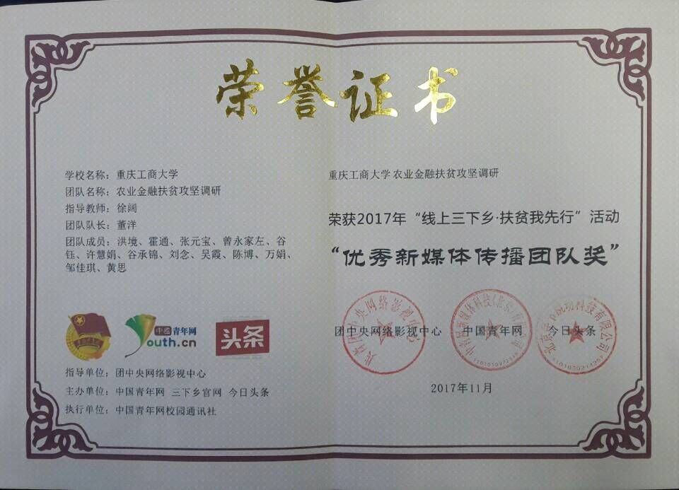 近日,taptap点点体育官网农业金融扶贫攻坚调研团荣获2017年团中央“线上三下乡·扶贫我先行 ”活动“优秀新媒体传播团队奖”, 据悉,在此次活动中,农业金融扶贫攻坚调研团在线上为30万余人答疑解惑。