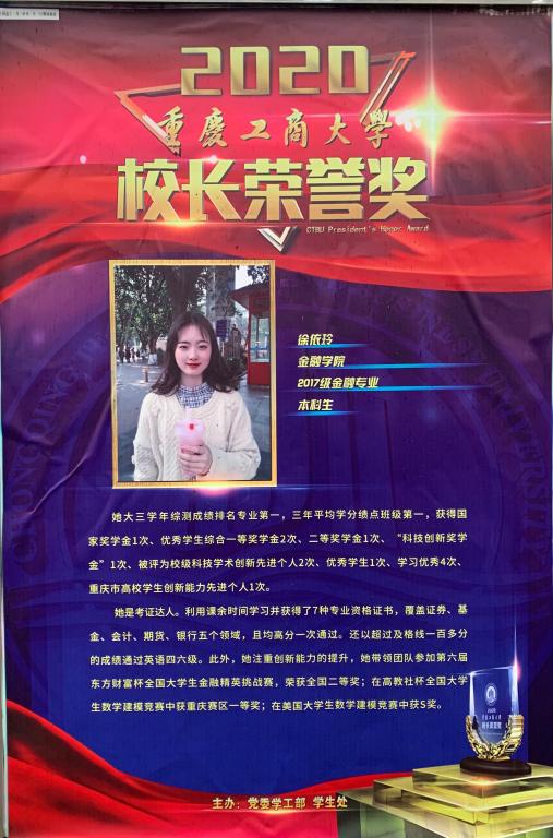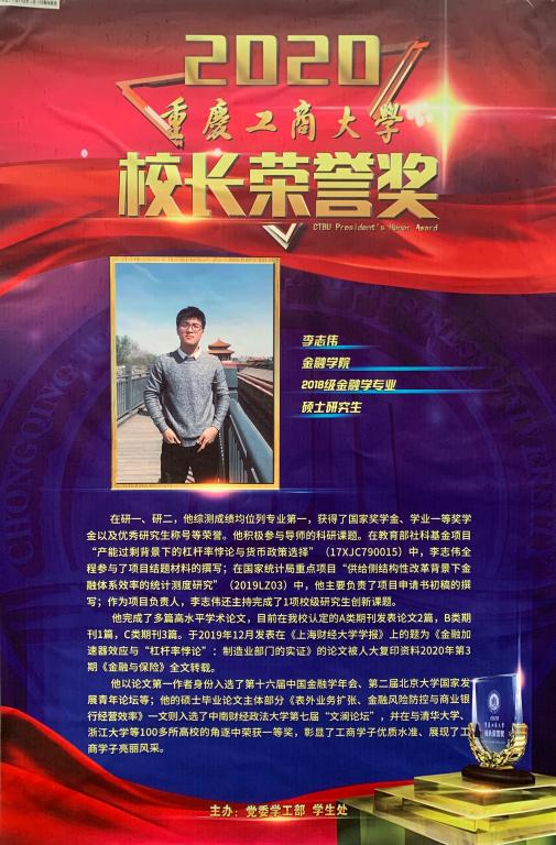 12月4日,taptap点点体育2020年“校长荣誉奖”颁奖典礼于大剧场圆满落幕。按照《taptap点点体育校长荣誉奖评选管理办法》,经学院推荐,学校复核、初评、谈话考察和评审等环节,taptap点点体育官网2018级金融学专业硕士研究生李志伟、2017级金融学专业徐依玲同学成功荣获2020年校长荣誉奖。