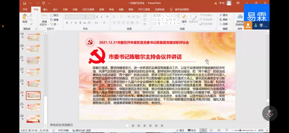 此次会议由李易霖同志主持,开展了十九届六中全会精神、党史学习教育总结会议精神、中央经济工作会议精神、中央农村工作会议精神、《党委(党组)书记抓基层党建工作述职评议考核办法(试行)》和陈敏尔在2021年度区县党委书记抓基层党建述职评议会上的讲话精神,共五个部分的学习。